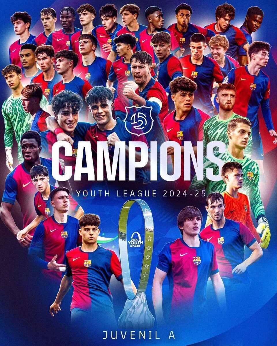 Молодёжная команда «Барселоны» в этом сезоне оформила требл❤️💙 В финальном матче молодежной ЛЧ против «Трабзонспора U-19» каталонцы одержали победу со счетом 4:1 и забрали очередной трофей! 🏆 Ла Лига 🏆 Кубок Испании 🏆 Лига чемпионов Трудимся и берём пример с молодежи Испании, чтобы в будущем достигать таких же высот ❤️🔥