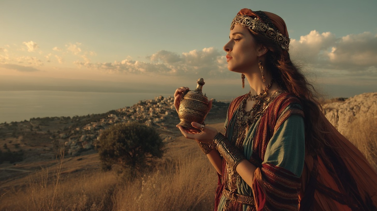 Создано на основе запроса: A wide shot beautiful first-century Israeli woman standing on a hill overlooking a fishing village in Galilee at sunset. Her head dress and skirt blow in the breeze as she looks lovingly at the ornate alabaster perfume jar in her hand. 4k Cinematic --- Автоперевод: Широко выстрела израильская женщина первого века, стоящая на холме с видом на рыбацкую деревню в Галилее на закате. Как тебе такое изображение? 🤔 https://dzen.ru/id/65c0c65c86e4f837c27b24d7 #ИИ #AI #нейросеть #midjourney #art