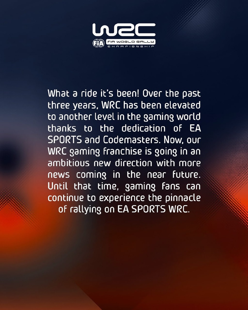 В ответ на пост Организация WRC заявила, что после окончания партнёрства с EA и Codemasters лицензия отправляется в «новое амбициозное направление». Больше новостей обещают раскрыть в ближайшем будущем, но фанаты верят, что лицензия вернётся к прошлым разработчикам — Kylotonn и Nacon.