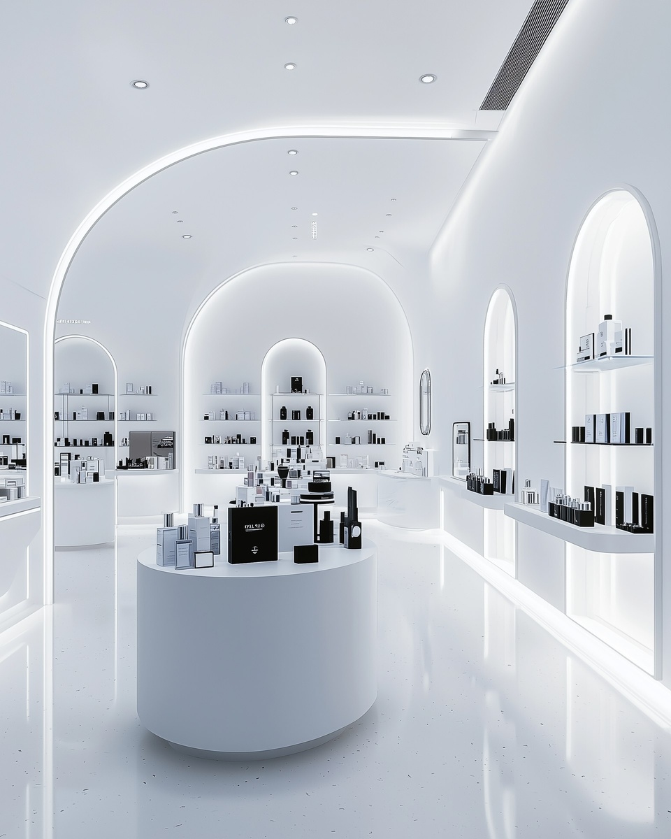 Создано на основе запроса: interior photograph of luxury cosmetic store with, clean and minimal interior sturcture, hyper-realism, black