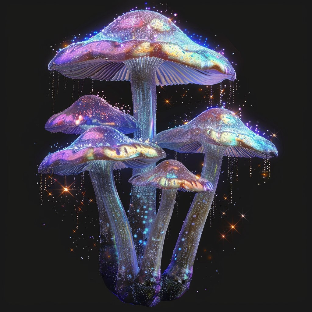 Создано на основе запроса: Isolated magical mushroom cluster, glowing tops, sparkling with iridescent light and cosmic dust, glittery gills