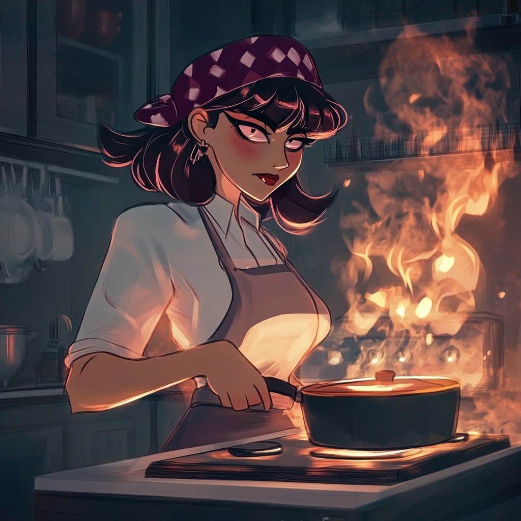 Создано на основе запроса: anime woman cooking over stove top with big flames and smoke, looking evil