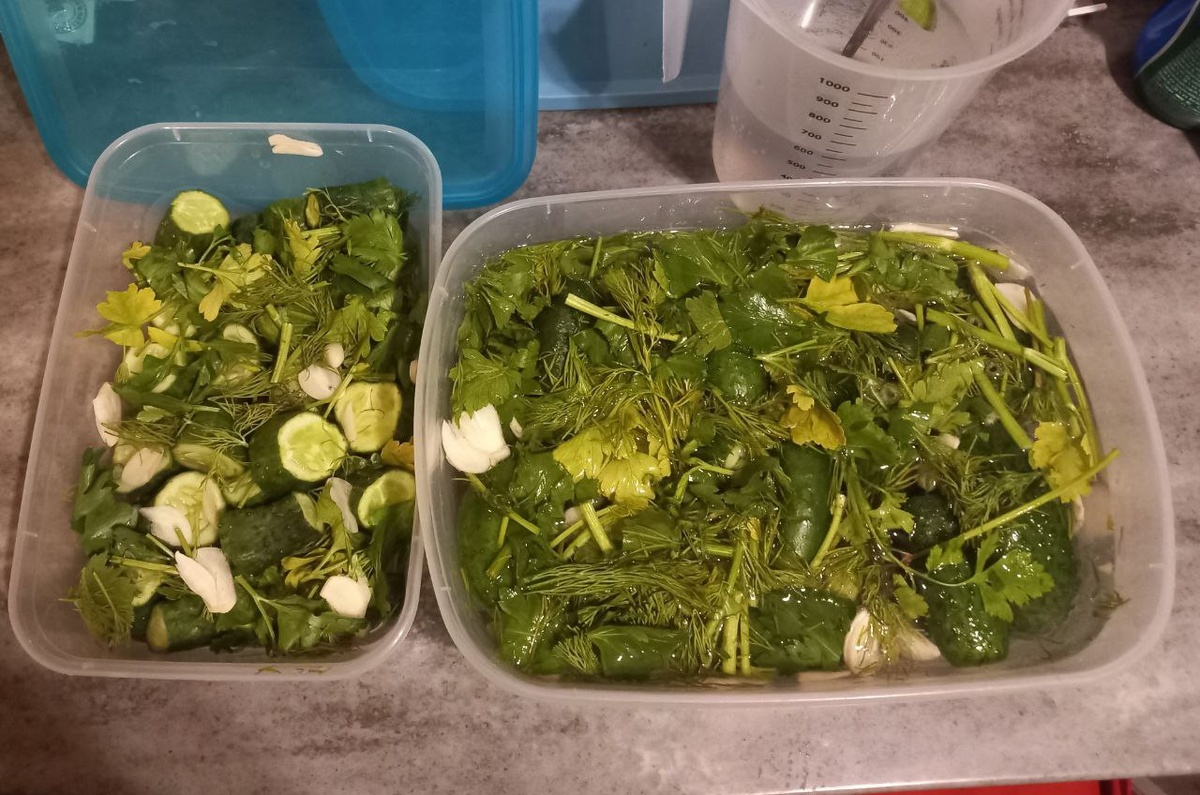 📌 #огурцы #малосольные #лучший #рецепт Ингредиенты: Огурцы небольшие, лучше пупырчатые - 1 кг Чеснок - 1 шт. некрупный Лавровый лист - 3–4 штуки Укроп и петрушка - ~50 г Минеральная вода ллучше Кармадон, сейчас Нарзан и Новотерская - 1,3 л Соль - 2 ст. ложки Приготовление: 1․ Огурцы помыть и удалить кончики с обеих сторон. Чеснок порезать пластинками. Зелень тщательно промыть и порезать крупно. 2․ Всё сложить в контейнер вперемешку. 3. Растворить соль в небольшом количестве минералки, долить оставшуюся и перемешать. 4. Залить огурцы солевым раствором чтобы они были покрыты полностью. 5․ Закрыть контейнер крышкой неплотно и убрать в холодильник примерно на сутки. Огурцы получаются хрустящие и чуток даже сладковатые😋. #нюансы Если у вас крупные огурцы, лучше нарезать каждый на кусочки, толщиной 1-2 см. Тогда время приготовления сократится. Пробуйте! Вялые огурцы тоже лучше нарезать, как у меня во втором контейнере (соседка принесла на переработку🤭)