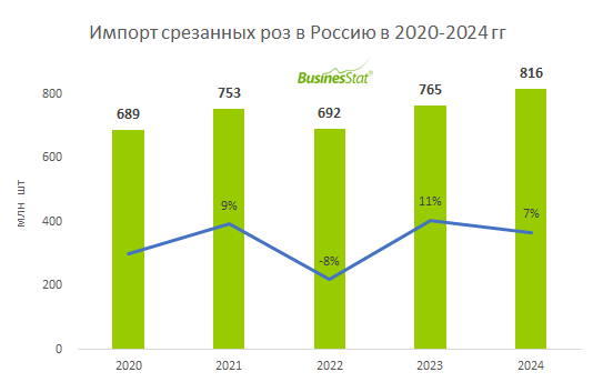 В 2024 г импорт срезанных роз в Россию вырос на 7% и составил 816 млн шт.