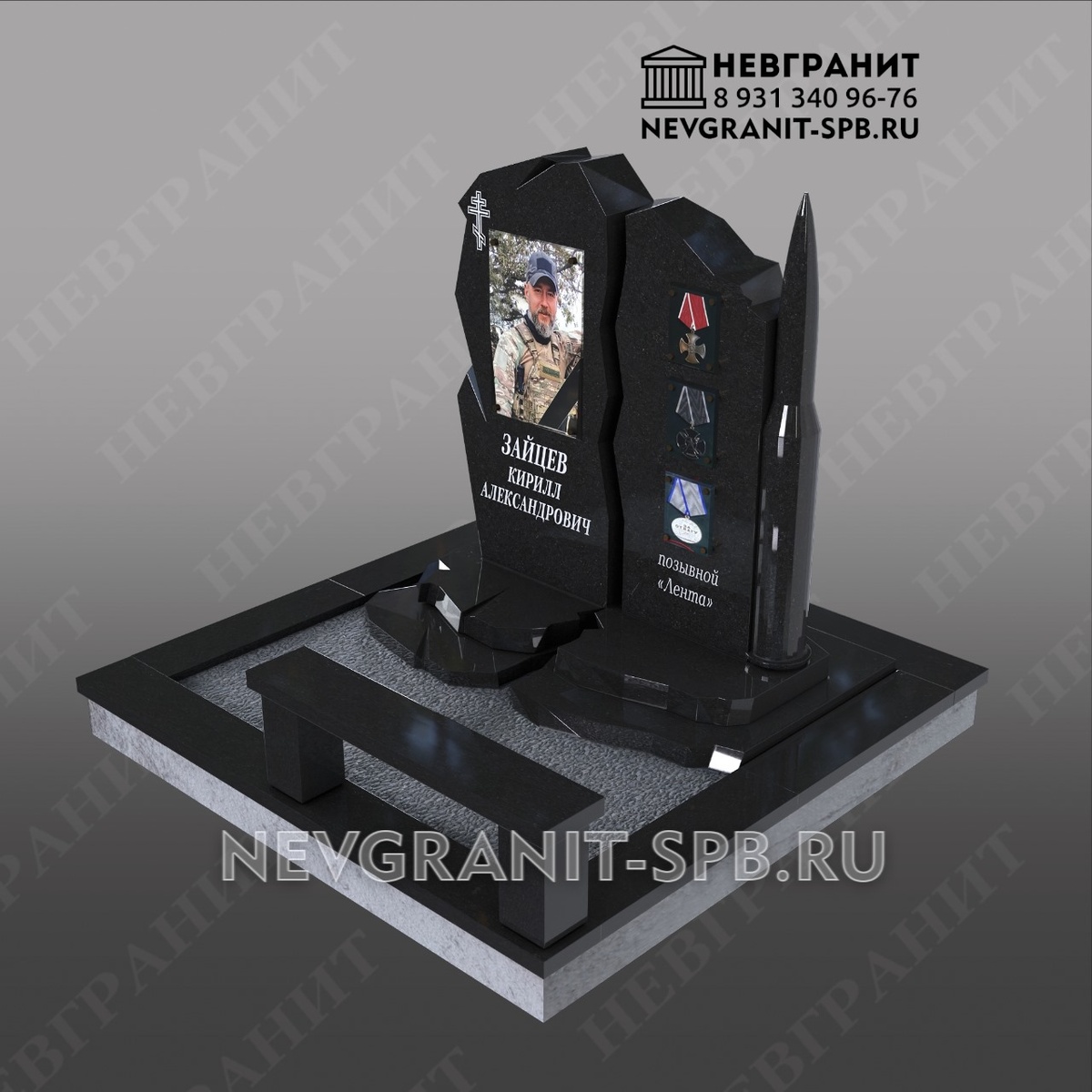 Выбор надгробия – это всегда сложный и эмоциональный процесс. Хочется, чтобы памятник не только увековечил память об ушедшем, но и отражал его жизнь, характер и заслуги. Сегодня мы расскажем о мемориальном комплексе, созданном в память о защитнике Родины, — произведении, где строгая лаконичность сочетается с глубоким уважением к подвигу. На фотографии представлен проект мемориала, выполненного из черного гранита. Его дизайн отличается строгостью и сдержанностью, что характерно для памятников, посвященных воинам. Комплекс состоит из: • Центральной стелы: Высокая вертикальная стела из черного гранита с неровными краями, напоминающими расколотый камень – символ трагической потери. На ней размещена фотография погибшего воина, его имя, фамилия и отчество. • Дополнительной панели: Рядом расположена вторая часть стелы с изображением государственных наград и надписи "Долг, Честь, Отвага", которые дополняют образ и подчеркивают воинский подвиг. • Основание: Тщательно выверенное основание из ч