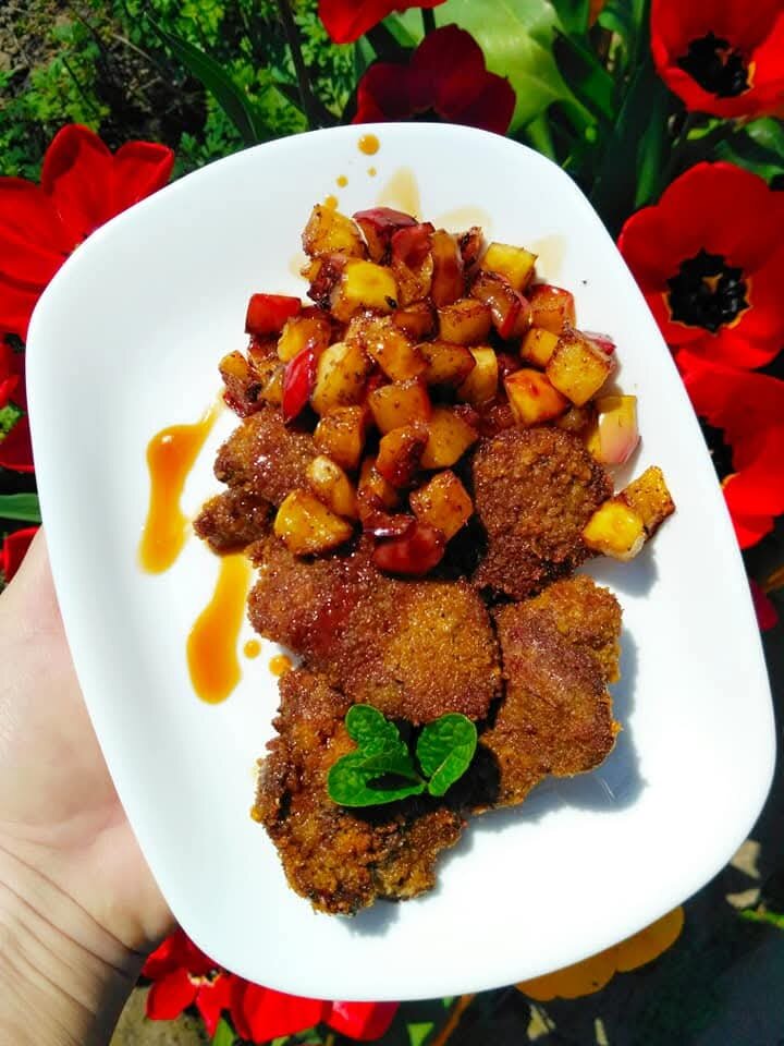 Всем предпраздничный привет! Дожили! Дожили до майских) А это значит - солнце, парад, выходные, шашлыки. И главный праздник года - День Победы. Всё это нас ждёт в ближайшую неделю) Ну, а пока ещё апрель, я напомню вам за два рецепта, простых и вкусных. На первое у нас щи с фрикадельками, а на второе - печень с яблоками. Вот с неё и начнем) * Куриная печень в сухарной панировке, с моим фирменным яблочным гарниром, и с бальзамическим соусом. Куриная печень очень благодарный продукт, готовить ее просто, быстро, и получается она вкусной, нежной. Но есть и минус - печень на сковороде любит « стрелять», обязательно учитывайте этот момент! Панировка печени дело не хлопотное, потому что панировка прилипает к печенке без особых усилий и лишних продуктов, яйца можно не использовать. Для панировки можно взять ароматные панировочные сухари ( можно готовые, такие продают, уже со специями). Можно приготовить панировку самостоятельно - натереть на терке ( средней) подсушенный хлеб, добавить молоты