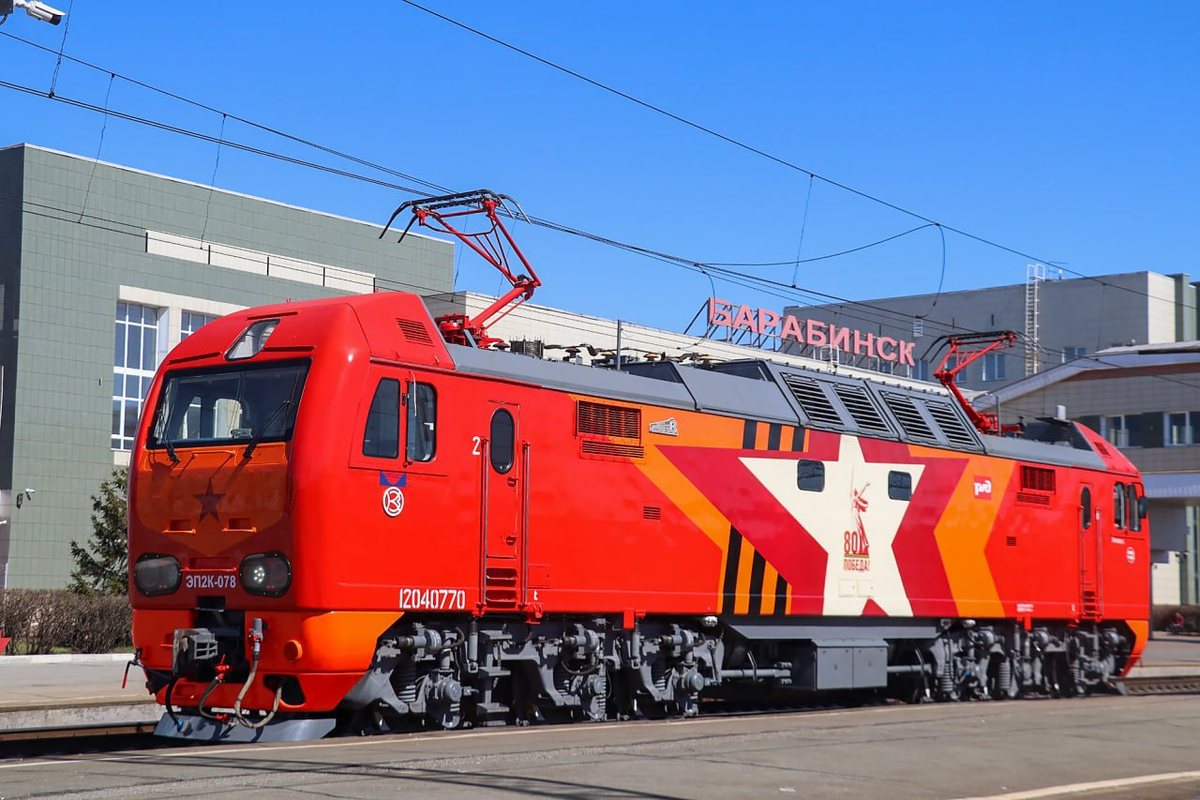 К 80-летию Победы в Великой Отечественной войне РЖД перекрасили несколько локомотивов. Главными героями стали тепловоз 3ТЭ28-80 и электровозы ЭП2К, получившие яркую и узнаваемую раскраску ко Дню Победы. Одним из самых заметных участников праздничной кампании стал магистральный грузовой тепловоз 3ТЭ28-80, построенный на Брянском машиностроительном заводе. Его кузов оформлен в ярко-красных и золотистых тонах, с крупными надписями и символами, посвященными 80-летию Победы. Этот локомотив отличается не только внешним видом. Впервые в истории завода новый локомотив отправился в депо приписки своим ходом, возглавив колонну из шести новых тепловозов. «Впервые новый тепловоз повезет себя и сплотку тепловозов с завода в депо приписки. Раньше тепловозы перегоняли и на месте уже экипировали, программировали и готовили к рейсам. В этот раз тепловоз со сплоткой своих собратьев прибудет в Тынду своим ходом», – рассказал железнодорожный фотограф Алексей Уланов. Сплотка проследует через всю страну от