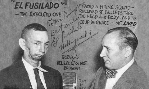 Венсеслао Могуэль Во время мексиканской революции студент Венсеслао Могуэль сражался на стороне мятежников. В марте 1915 года юношу арестовали, а затем без суда приговорили к смертной казни. Солдаты поставили революционера к стенке, выстрелили девять раз и ушли уверенные в том, что он мертв. Сомневаться было не в чем, ведь один из палачей произвел контрольный выстрел в голову Венсеслао. Но,как оказалось, казненный не только уцелел, но и прополз три квартала, пока не добрался до своих товарищей. Там ему оказали помощь. На память Венсеслао Могуэлю остались глубокие шрамы и изуродованная челюсть, а в тридцатые годы о его чудесном спасении стало известно миру. Сначала ученый Сантьяго Мендес Эспадас опубликовал его биографию, потом британская рок-группа Chumbawamba посвятила Могуэлю свою композицию. Кроме того, Венсеслао Могуэль не раз становился гостем популярных телешоу. Так, на знаменитом снимке, сделанном в 1937 году, он дает интервью Роберту Рипли — ведущему американской радиопередачи
