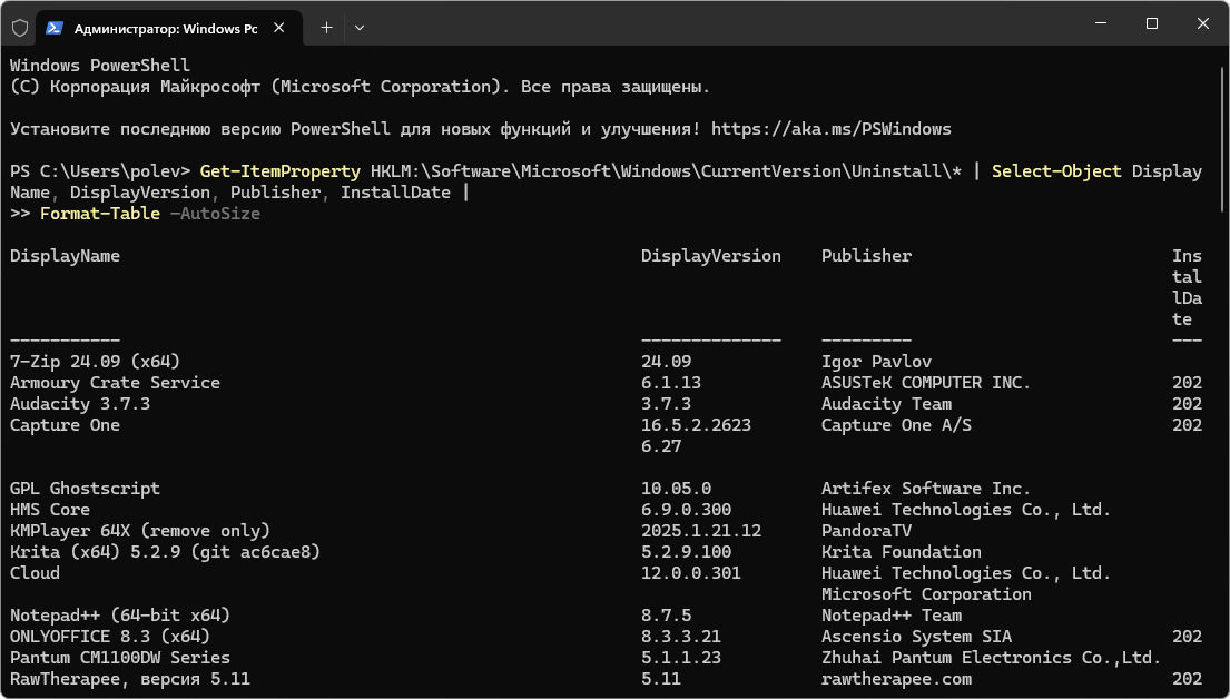 Get-ItemProperty HKLM:\Software\Microsoft\Windows\CurrentVersion\Uninstall\* | Select-Object DisplayName, DisplayVersion, Publisher, InstallDate |Format-Table –AutoSize