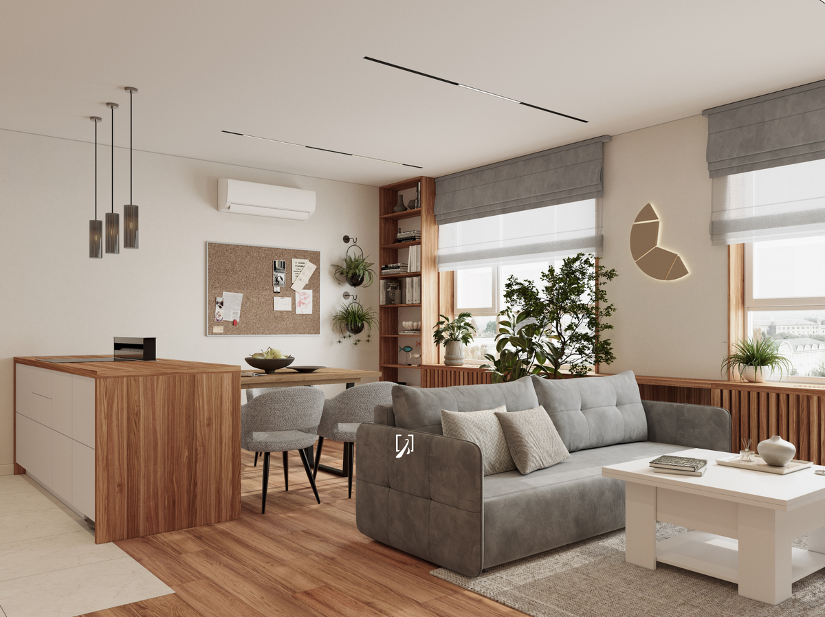 Мебель на заказ - беспроигрышное решение, если хочется выдержать единый стиль для всех комнат квартиры. Кухня-гостиная. Повезло и с формой (почти квадратная) и с площадью (27 м2), два окна. Все это позволило создать функциональную планировку со множеством сценариев отдыха. Заказчики - молодая пара, которые любят принимать гостей, поэтому предусмотрели дополнительные места для сидения на подоконниках, удобный диван, большой обеденный стол. Второе обязательное требование - удобная кухня с полным комплектом техники и отдельно стоящим островом. Одно из хобби хозяйки - кулинария. Дизайнер выбрала натуральную цветовую гамму - теплое дерево, белый, светло-серый и акцентный черный. Практически вся мебель в квартире будет изготовлена на заказ, что позволит достичь идеальной гармонии фактур и оттенков. Кроме того, визуально целостный интерьер всегда ощущается более дорогим и изысканным. Кабинет в квартире молодой семьи чаще всего превращается в детскую. Поэтому в этом проекте дизайнер сразу учл