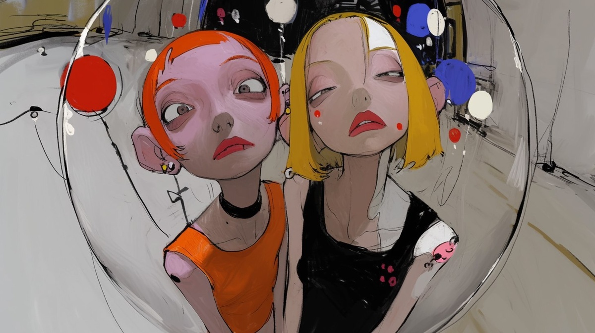Создано на основе запроса: open wide angle fisheye lens full shot, Two beautiful red short haired women with yellow long bob haircuts, pink and white tattoos, in the style of Hajime Sorayama with a digital art style, pastel colors, dreamy atmosphere, light background, glitch effect, cyberpunk vibes, digital painting, hyper-detailed illustrations, surrealistic details, glass sculptures, ethereal details, hyper-realism, holographic texture, red neon lights reflections, high resolution. --- Автоперевод: Открытый широкоугольный линз рыбий глаз. Как тебе такое изображение? 🤔 https://dzen.ru/id/65c0c65c86e4f837c27b24d7 #ИИ #AI #нейросеть #midjourney #art