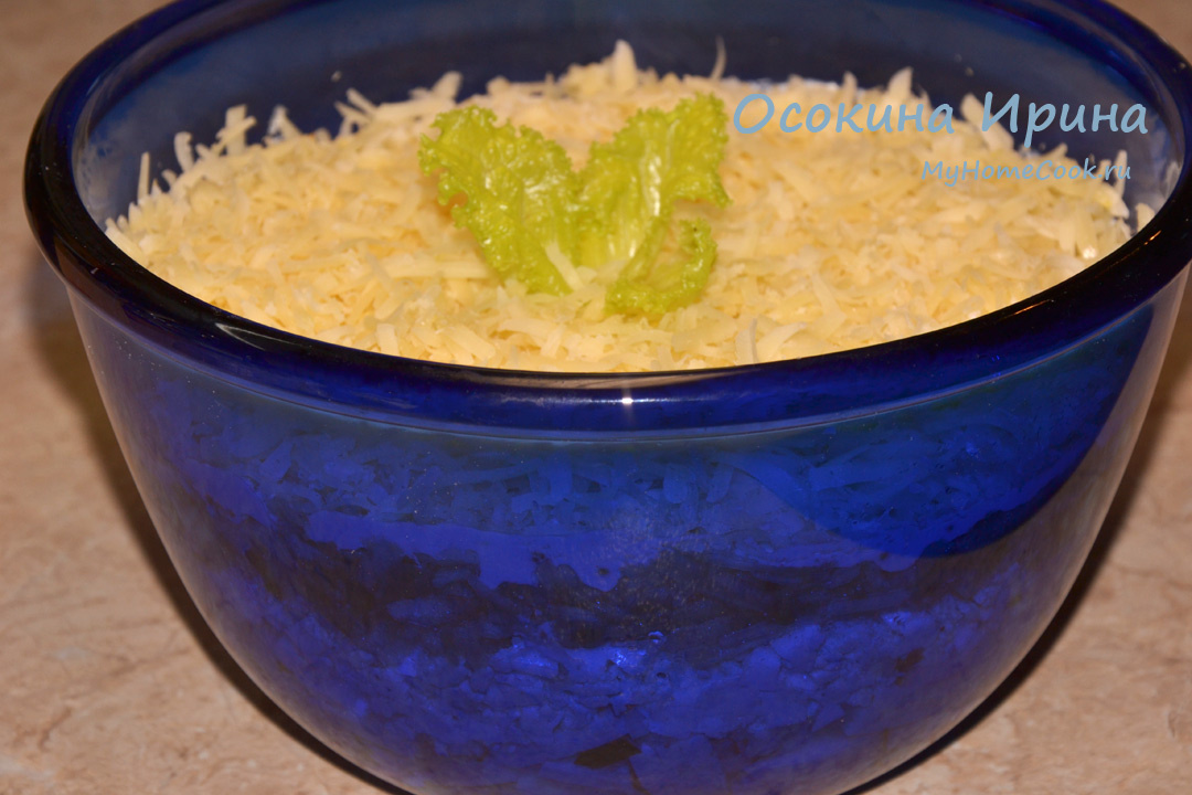 Слоёные салаты готовлю редко (куда быстрее и проще всё порезать и смешать), но иногда заморачиваюсь и это того стОит. Итак, начала с приготовления соуса: в миске смешала 2/3 стакана сметаны, 1 ст.л. зернистой горчицы, 1 ч.л. лимонного сока, соль и перец по вкусу и промешала, затем переложила в кулинарный пакет и срезала уголок - так удобнее выкладывать соус тонким слоем. Немного соуса выложила на дно салатника, затем уложила слой из 200 г копчёного свиного карбонада соломкой, смазала тонким слоем соуса, затем посыпала половиной мелко рубленной красной луковицы, снова немного соуса, следующим выложила слой из трёх мелко рубленных отварных яиц, смазала соусом, после уложила слой из двух очищенных зелёных яблок на крупной тёрке, смазала остатками соуса, посыпала всё 70 г тёртого на мелкой тёрке твёрдого сыра, настояла час в холодильнике и подала. Очень вкусный, сочный и неизбитый салатик) Приятного аппетита