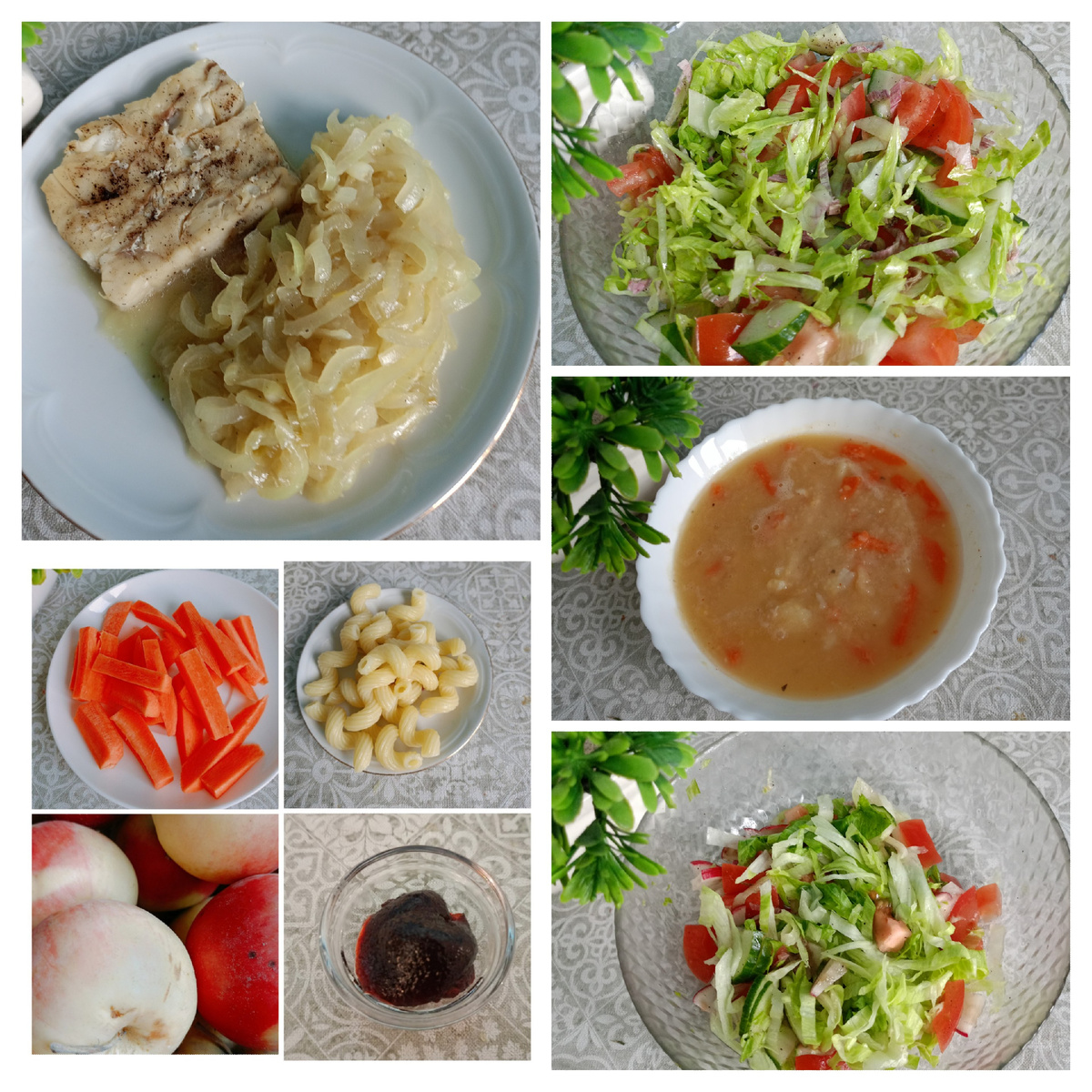 Обед - салат из айсберга, помидора, редиски, огурца; филе минтая припущенное; макароны вместо хлеба.