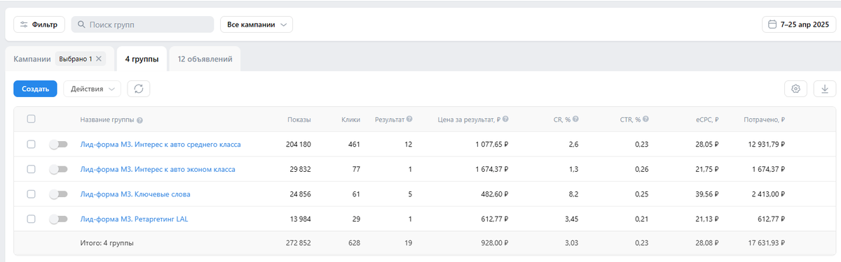 Цель кампании: привлечение потенциальных покупателей через лид-форму с заявками на покупку Москвича. Задачи кампании: Для достижения целей и задач кампании мы ориентировались на два основных показателя: Также мы анализировали: Нами была запущена одна кампания и протестировано 4 таргетинга: Выбор остановили на автоматической стратегии «Минимальная цена за результат» с оптимизацией на дневной бюджет. Кампания работала с 7 по 25 апреля 2025 года. ГЕО — Курская область. Социально-демократическая группа — возраст от 35 до 60 лет. Ключевые фразы, которые показали результат: «купить москвич», «завод москвичей», «москвич электромобиль», «москвич современный». Использовался один имидж с ключевой информацией: Также протестировали 3 месседжа в объявлениях: Лучше всего сработал третий вариант – люди боятся упустить возможность (11 заявок). В процессе только немного скорректировали аудиторию, когда увидели, что на ключевые слова оставляют заявки больше мужчины, а на интересы женщины. Мы запустили р
