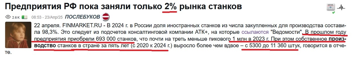 У всех этих брутальных технарей (коими представляются в обсуждениях), годами здесь же рассказывавших про непрерывную деиндустриализацию России ничего даже не шелохнулось в головах на предмет "КАКИЕ 693 000 СТАНКОВ закупаемых предприят