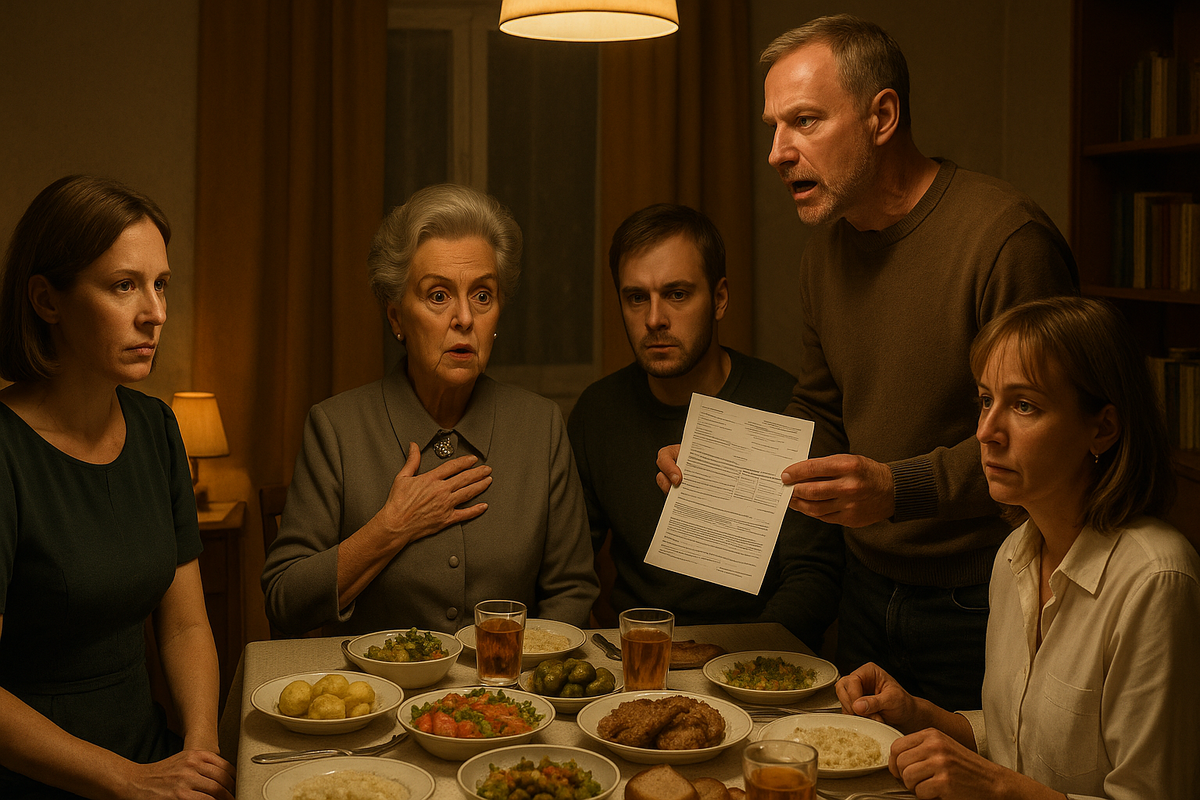 В столовой повисла мёртвая тишина. Даже часы, казалось, перестали тикать. Галина Петровна взяла дрожащими руками листок, поднесла к глазам, потом бросила обратно на стол.