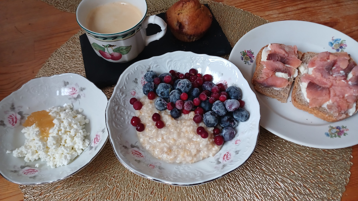 Сегодня на завтрак доедаем апрельскую еду 😊 Но все же шведский стол в наличии 👌 Сварила овсяную кашу, было немного творога, кусочек копченой горбуши. В кашу добавили ягоды, в творог - персиковый джем, с горбушей сделала бутерброды. Еще пекла кексы с брусникой. На обед был готов рассольник и запеченная грудинка на бутерброды Грудинка в этот раз просто исключительная получилась, не очень жирный кусочек был и после обеда кофе с брусничным кексом На ужин у нас гречневая лапша со свининой и овощами. Заправлена кунжутным маслом. Сверху посыпала зеленым луком (с подоконника) В соус добавила ложечку пасты том ям. Она дает очень приятный аромат, легкую остринку. Мне понравился такой вариант. Меню год назад Экономно ли покупать куриную грудку? Считаем с весами и калькулятором Девушки, для тех, кто спрашивал про заморозку ягод, я подробно рассказывала вот здесь: Как заморозить ягоды: чернику, голубику, смородину, бруснику Как заморозить клубнику Про черешню напишу в ближайшее время.