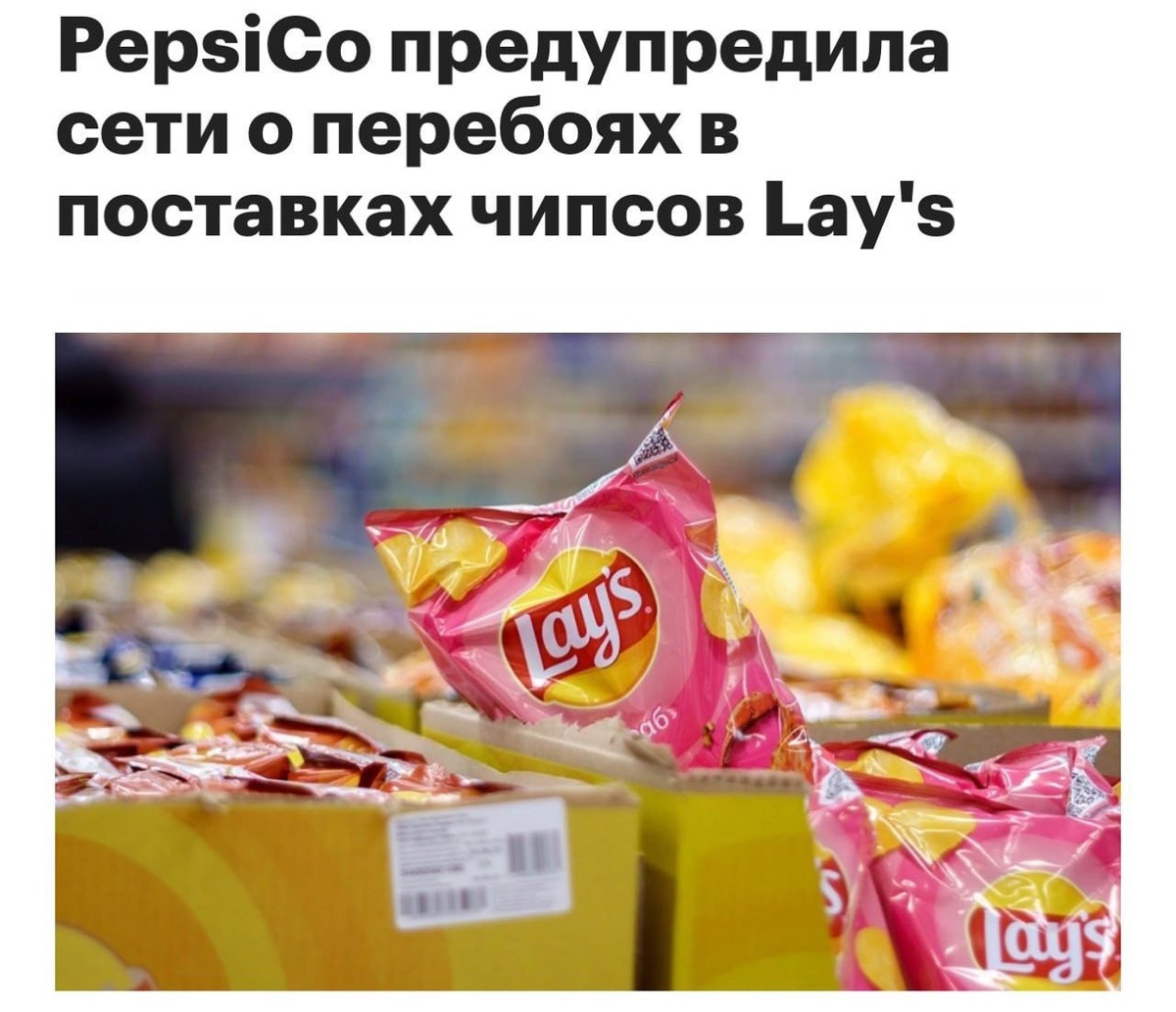 Компания PepsiCo уведомила торговые сети о возможных перебоях в поставках своих снеков. Основной причиной этого стали трудности с упаковкой продукции. В магазины, в частности, поступают такие популярные чипсы, как Lay's и Cheetos, а также сухарики «Хрустим». Остается надеяться, что ситуация скоро улучшится! 😊