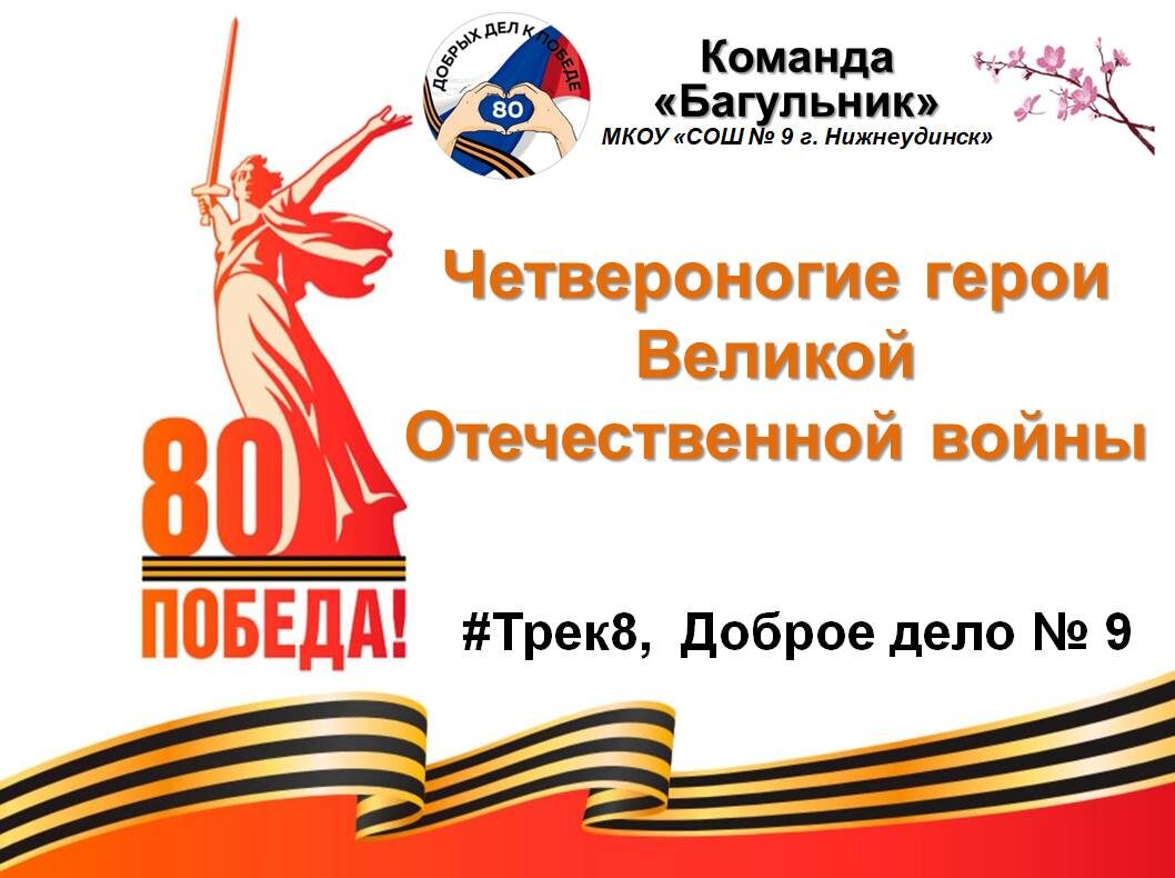#Трек8 «Научные и образовательные проекты» Доброе дело 9: Четвероногие герои Великой Отечественной войны Так же как людей, военкоматы, На войну призвали лошадей, Ведь они такие же солдаты, Верные помощники людей. Они были рядом с людьми – безмолвные помощники и боевые товарищи, кавалерийские, партизанские, вьючные и обозные. Лошадям не давали орденов и званий. Они совершали подвиги, не зная этого. Они просто делали то, чему их научили люди – и погибали, как и люди, помогая приблизить долгожданный День Победы. Участники команды «Багульник» смонтировали видеоролик о том, какой весомый вклад внесли Лошади в годы Великой Отечественной войны! Ссылка на видеоролик: https://disk.yandex.ru/i/_bjn3nFT40YigQ #80ДобрыхДелКПобеде #ФорумКлассныхРуководителей #Сферум80ДобрыхДел