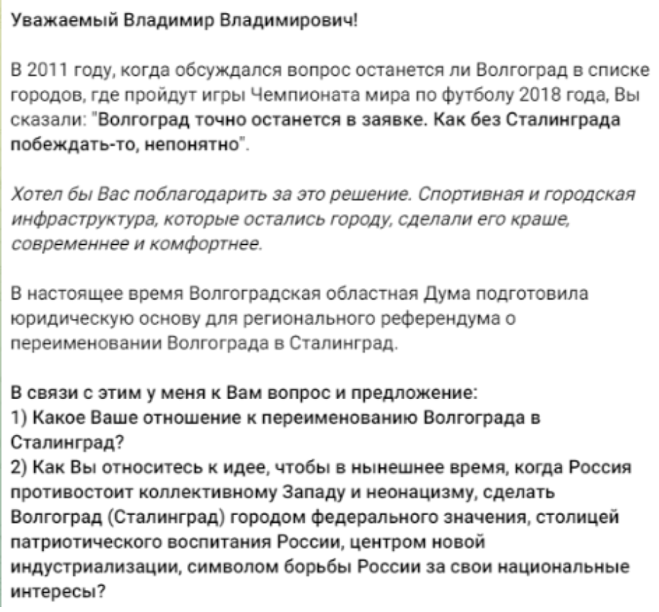 5 декабря 2023 года я опубликовал статью «России нужен Сталинград ?!» на основании своего вопроса на Прямую линию Президента России В.В. Путина : https://dzen.ru/a/ZW8d0vh8qlPTArLd . Эта статья о моем вопросе Президенту Путину вызвала бурю эмоций у читателей и собрала 640 комментариев в Дзен, что достаточно много для любой другой статьи на моей странице. И вот спустя два года последовал ответ. Но не мне, а всем волгоградцам и всему миру. 29 апреля 2025 года, находясь в Волгограде, Президент РФ Путин В.В. в преддверии 80-летия Победы в Великой Отечественной Войне согласился на предложение Губернатора Волгоградской области и пообещал по возвращению в Москву подписать Указ о переименовании аэропорта Волгограда в «Сталинград». А уже вечером того же дня пресс-служба Кремля опубликовала подписанный Президентом указ о присвоении аэропорту Волгограда исторического наименования «Сталинград»: http://kremlin.ru/acts/news/76826 . А сегодня, 30 апреля 2025 года, Президент В.В. Путин пообещал под