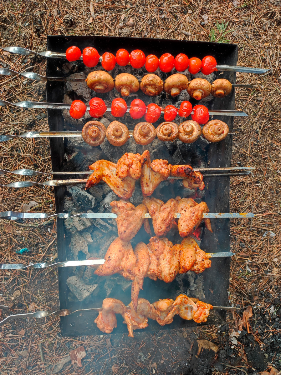 Не ограничивайтесь просто курицей и свининой. Возьмите все виды мяса и маринадов понемногу, включая шпикачки (сардельки с салом), сосиски и купаты. Так вы разнообразите шашлычный стол и точно найдёте вариант, который понравится каждому. 3. Если лень мариновать