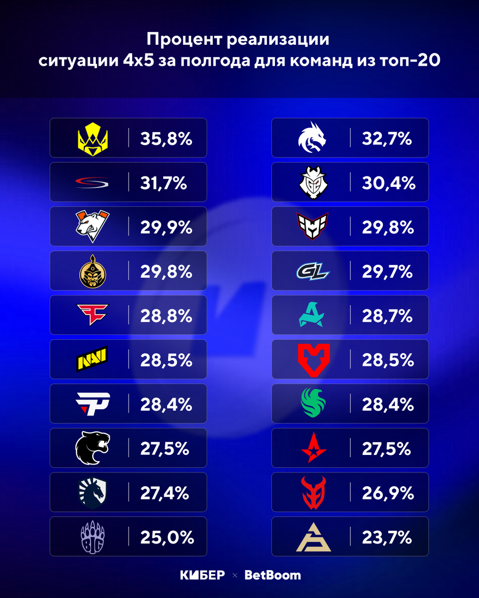 Изучаем статистику топ-20. Мы уже разбирали, как команды реализуют 5х4: в большинстве случаев побеждает команда, совершившая первое убийство. В этом материале посмотрим, какие составы лучше других противостоят этой ситуации. Для анализа мы взяли данные за последние полгода в матчах против команд из топ-20. Статистика актуальна на 30 апреля 2025-го. ➢ В целом большинство составов показывают схожие результаты. ➢ Только четыре команды выигрывают больше 30% раундов, когда остаются в меньшинстве. ➢ С 5-е по 12-е место очень плотная группа команд: от Virtus.pro до Falcons, разница между ними меньше 1,5%. ➢ Неожиданно высоко Complexity и Heroic, которые показывают цифры на уровне лучших команд. ➢ 3dmax была в топ-6 по реализации 5х4, но в обратной ситуации она среди худших. ➢ Virtus.pro испытывает в последнее время проблемы, но в нашей таблице она в топ-5. Для CT потеря одного игрока – большой удар: защите сложнее контролировать большое пространство и добывать информацию. ➢ Таблица для CT уди