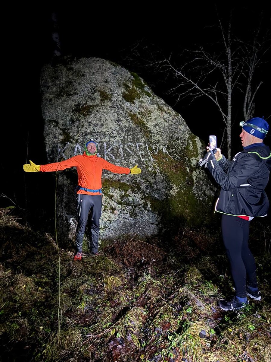 На десятый раз повторения одного и того же события мозг настроился на аналитический лад. Я наблюдал за всем с удовольствием и как бы со стороны. Пит стоп. Можно постоять несколько минут, но тут же замерзаешь. Алексей привез свою фирменную оранжевую гирю и доски с гвоздями. Если за гирю мы периодически брались, то с гвоздями только фотографировались. Много еды, чай в термосах, шутки, свет фар, выхватывающий кусок лесной дороги, броуновское движение фигур вокруг, свет от налобных фонариков, руки с чашками чая и бутербродами. Свет в лицо не слепит, потому что не надо ничего разглядывать. Все действия здесь спонтанно-автоматические, все люди здесь известны тебе не в лицо, а по голосу, одежде, рукам, движениям. Но вот отдых кончается и пора бежать дальше. Турбулентность света переходит в ламинарный поток, несколько лучей складываются, в сумме выхватывая пятно, сопоставимое с фарами ближнего света автомобиля. Но всё же это бесконечно мало по сравнению в массивом окружающих лесов, полей и озёр. Перед глазами всегда черно-белое пятно лесовозной дороги с голыми деревьями по сторонам. И это один из инструментов киута. Депривация внешних впечатлений до минимума, дальше которого только полная темнота и перенос фокуса внимания на людей рядом и свое внутреннее состояние.