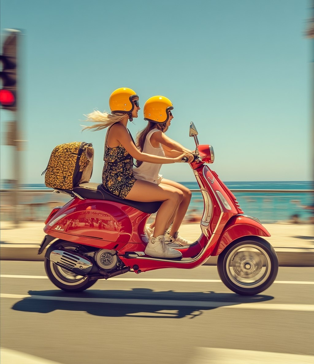 Создано на основе запроса: Photo of two people on the back seat of a red and yellow Vespa motorcycle, driving fast with one arm extended through traffic lights and streets along the coast. They are wearing helmets and white shirts. The woman wears a black dress with a golden pattern print and high-heeled shoes. The image has a motion blur effect, captured on a summer day with a blue sky and a seaside cityscape in the background, in the style of Leica M6. --- Автоперевод: Фото двух человек на заднем сиденье красного и желтого мотоцикла Vespa, быстро проезжая с одной рукой, простиранной через светофоры и улицы вдоль побережья. Круто получилось? 🤔 https://dzen.ru/id/65c0c65c86e4f837c27b24d7 #ИИ #AI #нейросеть #midjourney #art