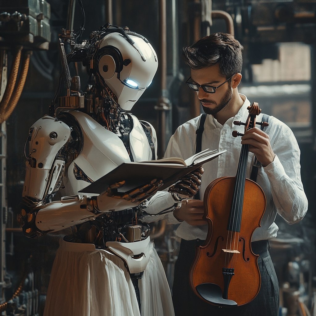 Создано на основе запроса: 3 PERSONS - AI character as technological character , Music as Musision with violin , poetry as man with book