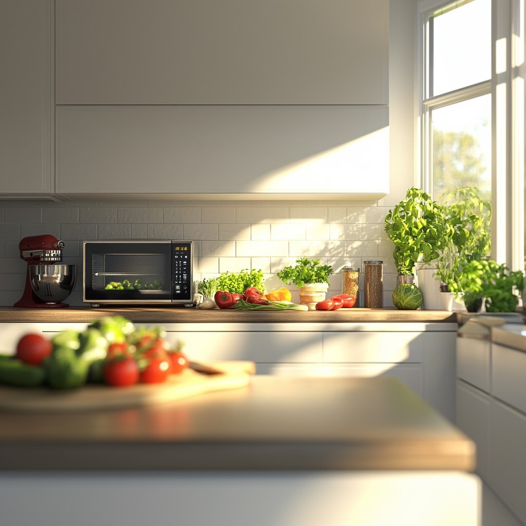 Создано на основе запроса: A contemporary kitchen using a microwave minimal energy readout, fresh vegetables being steamed directly