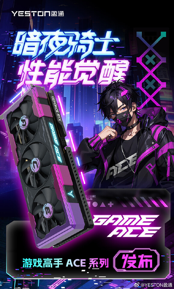 Китайская компания Yeston представила новый дизайн из серии Game Ace, который заметно отличается от предыдущих моделей. Этот выпуск выполнен в более тёмной гамме с элементами розового и фиолетового цветов, что делает его стилистически далёким от яркой и романтичной линейки Sakura Atlantis. Вместо ассоциаций с фэнтези, новинка погружает в атмосферу научной фантастики. В официальном аккаунте Weibo была опубликована информация о загадочном персонаже — мужском протагонисте, названном "Тёмным рыцарем". В тексте к анонсу говорится о параллельной вселенной под номером 207, где скрывается герой, чья история предстоит разгадке со стороны пользователей. Такая идея может быть связана с маркетинговой кампанией или дальнейшими планами по созданию игрового нарратива вокруг продуктов компании. В частности — видеокарт. Несмотря на отсутствие технических деталей, визуальные намёки позволяют сделать выводы. На рекламных материалах видна надпись GeForce RTX белого цвета и стандартный 8-пиновый разъём пит