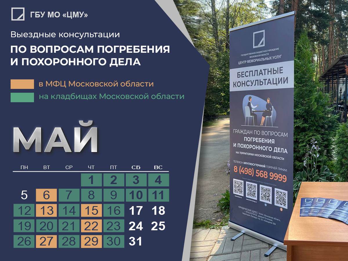 Бесплатные консультации в МФЦ Московской области от специалистов ГБУ МО «Центр мемориальных услуг» по вопросам погребения и похоронного дела Спешите получить консультацию в МФЦ вашего города, согласно графику выездов, от специалистов ГБУ МО «Центр мемориальных услуг». Если вы хотите узнать о законодательстве в сфере погребения и похоронного дела - приходите в МФЦ на консультацию. Наши специалисты ответят на все интересующие вас вопросы. · 06.05. - МФЦ, Московская обл., г.о. Клин, г. Клин, Советская пл., д. 18А · 13.05. - МФЦ, Московская обл., г.о. Красногорск, г. Красногорск, ул. Ленина, д. 2 · 15.05. - МФЦ, Московская обл., г.о. Талдомский, г. Талдом,
