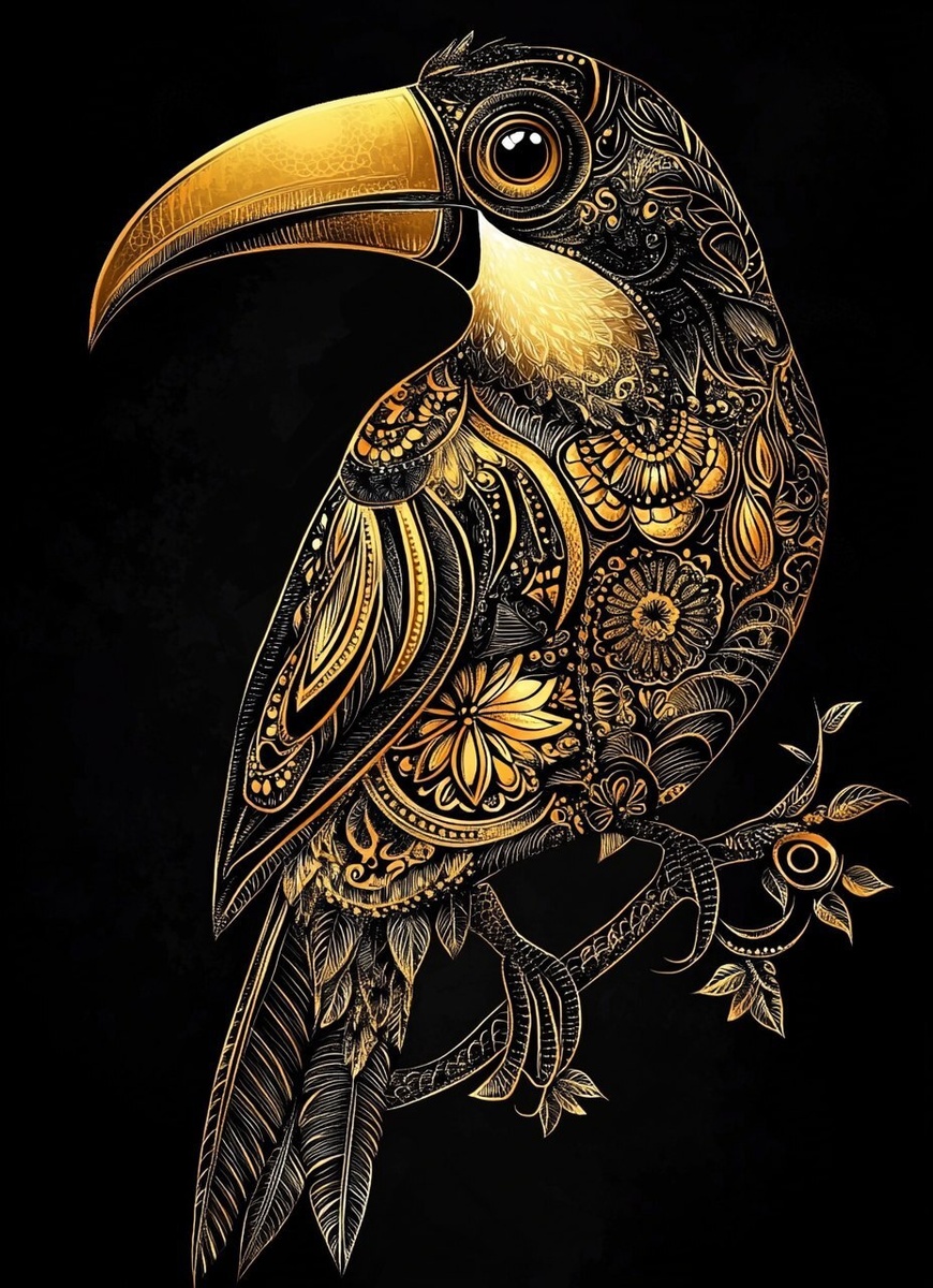Создано на основе запроса: GOLDEN AND BLACK toucan,DRAWING STYLE,golden and black colors,mandala inside the body,BLACK BACKGROUND