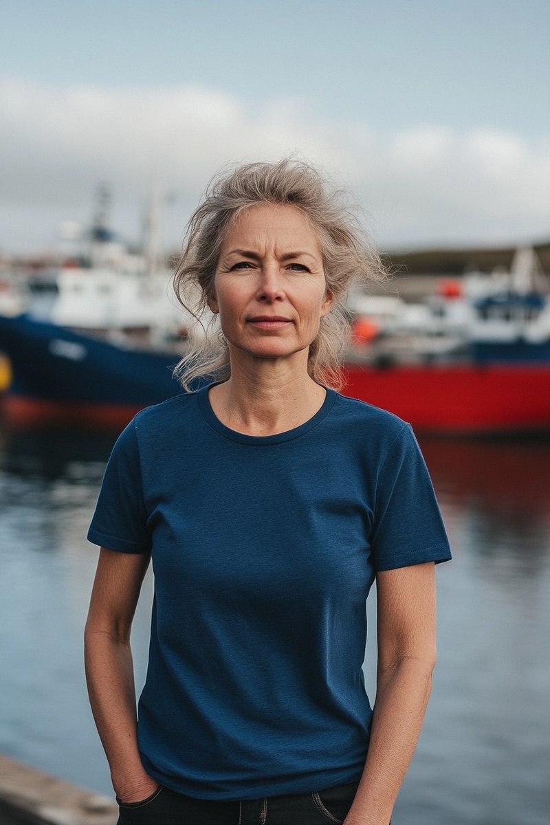 Создано на основе запроса: a middle aged icelandic woman wearing a blue t-shirt by the harbour