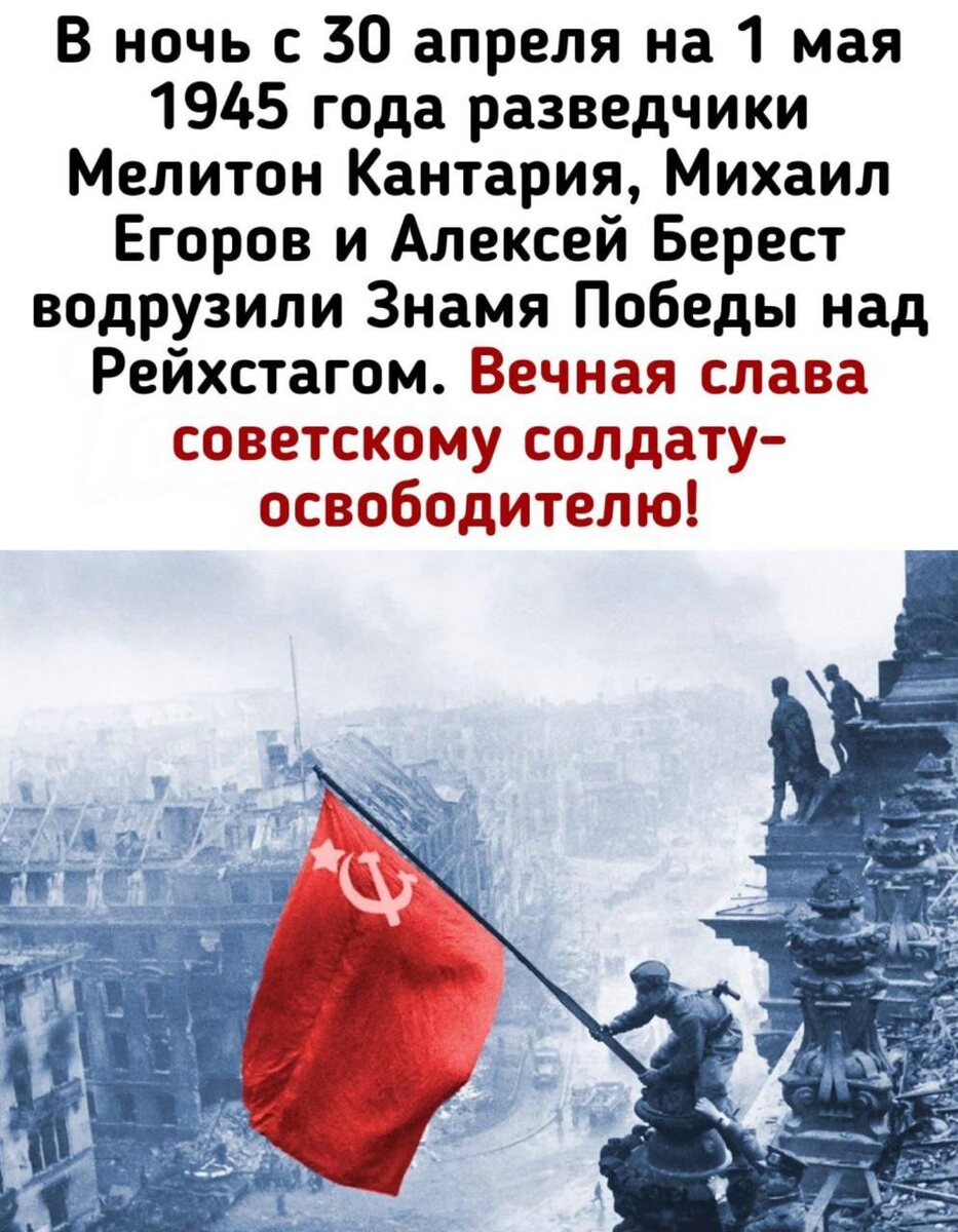 В ночь с 30 апреля на 1 мая 1945 года разведчики Мелитон Кантария, Михаил Егоров и Алексей Берест водрузили Знамя Победы над Рейхстагом