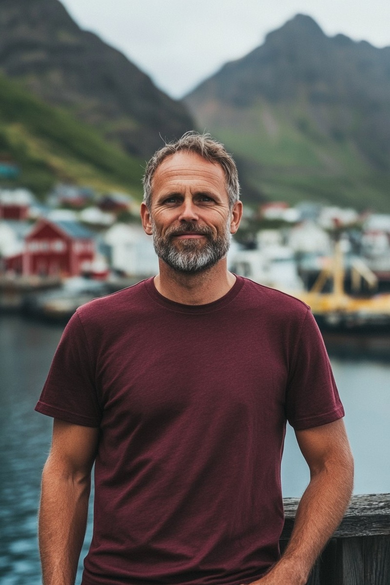 Создано на основе запроса: a middle aged icelandic man wearing a maroon t-shirt by the harbour