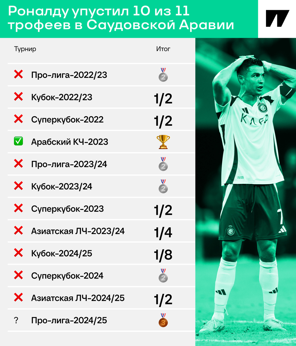 Ну никак не выиграть ничего значимого. Криштиану Роналду вылетел из азиатской Лиги чемпионов: «Аль-Наср» проиграл 2:3 японскому «Кавасаки Фронтале». От них же до этого вылетел и Леонид Слуцкий с «Шанхай Шеньхуа». Для португальца это уже привычно: десятый проигранный «Аль-Насром» турнир с момента подписания Криштиану. За два с половиной года ни разу не удалось победить ни в чемпионате Саудовской Аравии, ни в ЛЧ, ни в Кубке короля, ни в Суперкубке. Но он не сдается скоро переподпишет контракт с повышением зарплаты. Роналду упустил уже 10-й трофей. Грустный юбилей! И снова, и снова, и снова. ● Криштиану дважды был вторым в чемпионате Саудовской Аравии – конечно, после «Аль-Иттихада» и «Аль-Хилаля». Три местных гранда и лишь «Аль-Наср» никак не может взять золото. ● Местный кубок тоже не покоряется: один раз сыграли в финале, два – вылетали в плей-офф. Тоже самое с Суперкубком с Саудовской Аравии. ● В азиатской ЛЧ «Аль-Наср» с Криштиану, королем европейской Лиги чемпионов, ни разу не выхо
