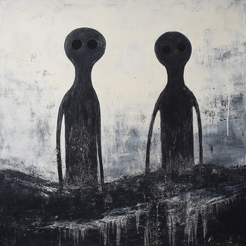 Создано на основе запроса: two strange beings find each other in a desolate lonely eerie cold apocalyptic world in the style of Stanley Donwood --- Автоперевод: Два странных существа находят друг друга в пустынном жалком апокалиптическом мире в стиле Стэнли Донвуда Как тебе такая картинка? 🤔 https://dzen.ru/id/65c0c65c86e4f837c27b24d7 #ИИ #AI #нейросеть #midjourney #art