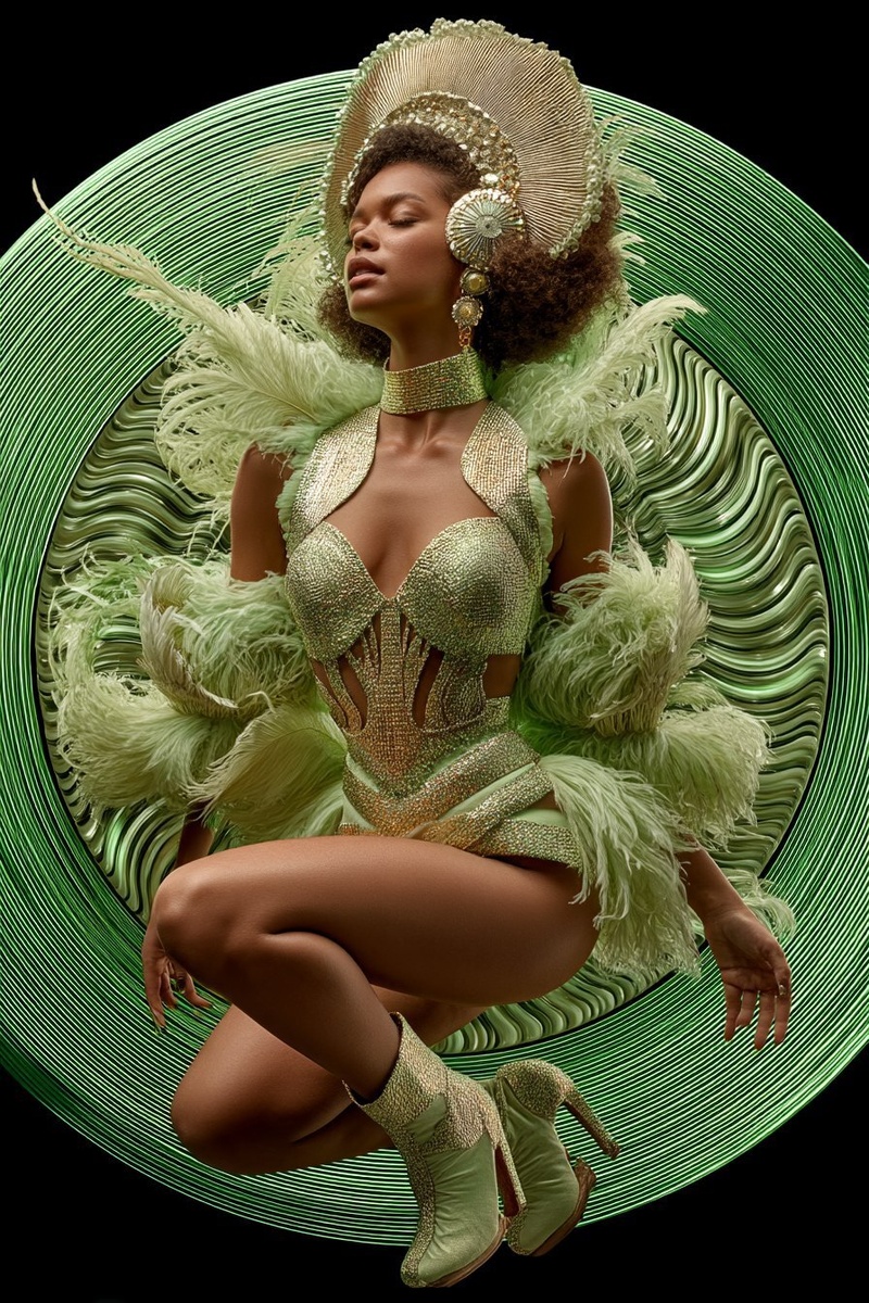 Создано на основе запроса: Photorealistic fashion portrait of a Black Brazilian samba queen dressed in a neon metallic feathered costume inspired by 1970s Rio Carnival and retro-futurist armor plating, posed mid-stride with glowing heels and chrome shoulder fans, hair voluminous with LED jewels, in a circular frame with fisheye lens distortion and psychedelic green light flares, styled with LaChapelle meets Tim Walker editorial surrealism ed whimsical glamour. --- Автоперевод: Фотореалистический модный портрет черной бразильской королевы самбы, одетый в неоновый металлический костюм, вдохновленный рио-карнавалом 1970-х Какое твое впечатление? 🤔 https://dzen.ru/id/65c0c65c86e4f837c27b24d7 #ИИ #AI #нейросеть #midjourney #art