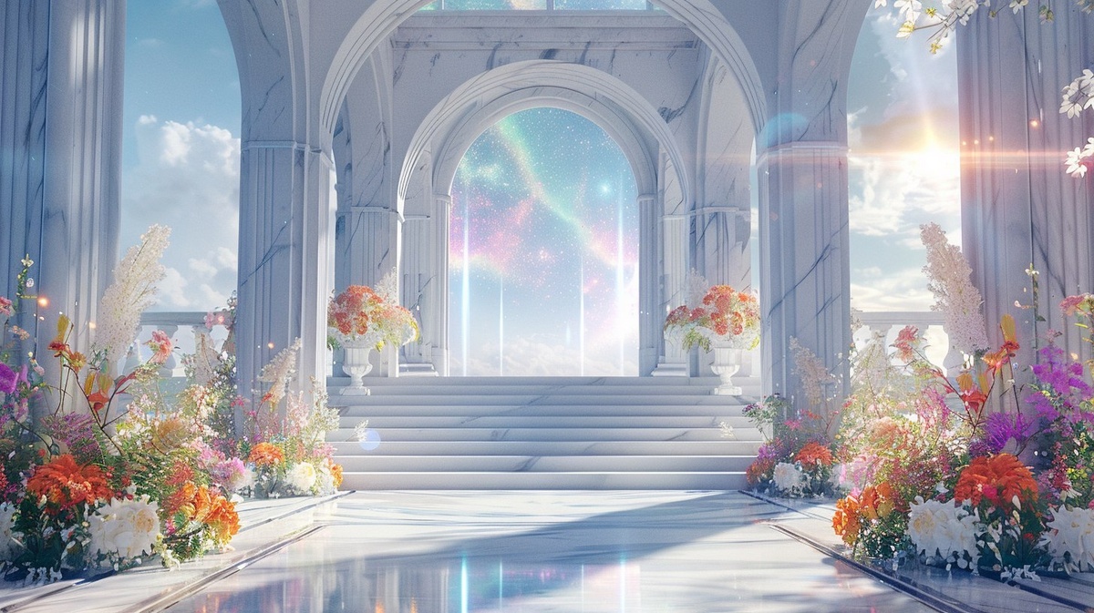 Создано на основе запроса: Hyper-realistic celestial white temple library with grand arched architecture and wide, ascending marble stairs
