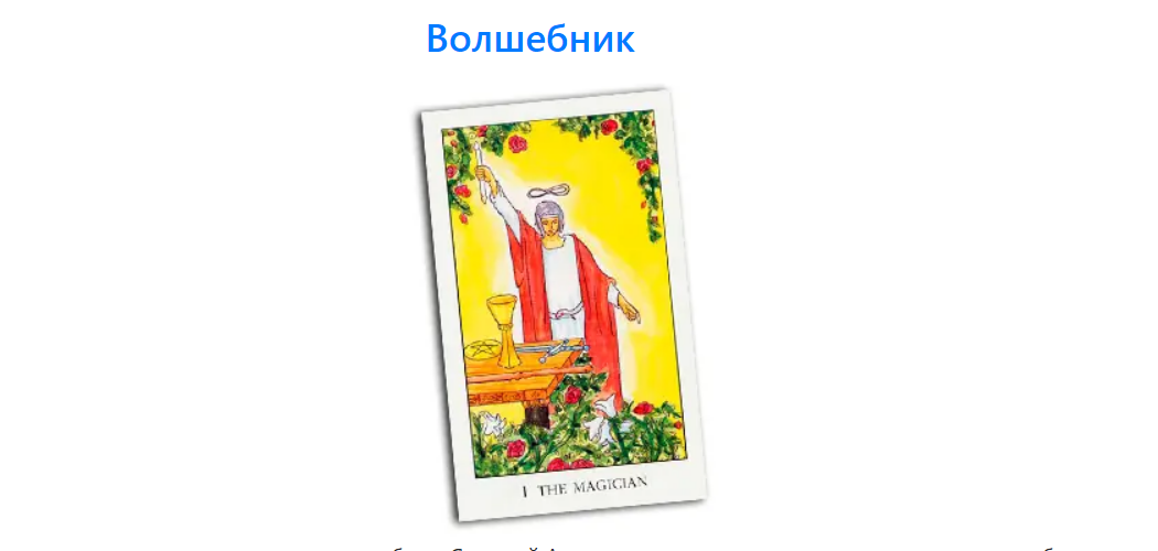 Маг или Волшебник часто ассоциируется с людьми, обладающими острым умом и навыками общения. Его появление в раскладе говорит о высокой степени уверенности в себе и решимости, которая позволяет воплощать идеи в жизнь. Эта карта практична и её советы лучше всего применять к реальным, осязаемым аспектам жизни, а не к абстрактным или теоретическим. Ваш успех в будущих начинаниях в политике или бизнесе будет зависеть от вашей силы воли и решимости. Прошлое