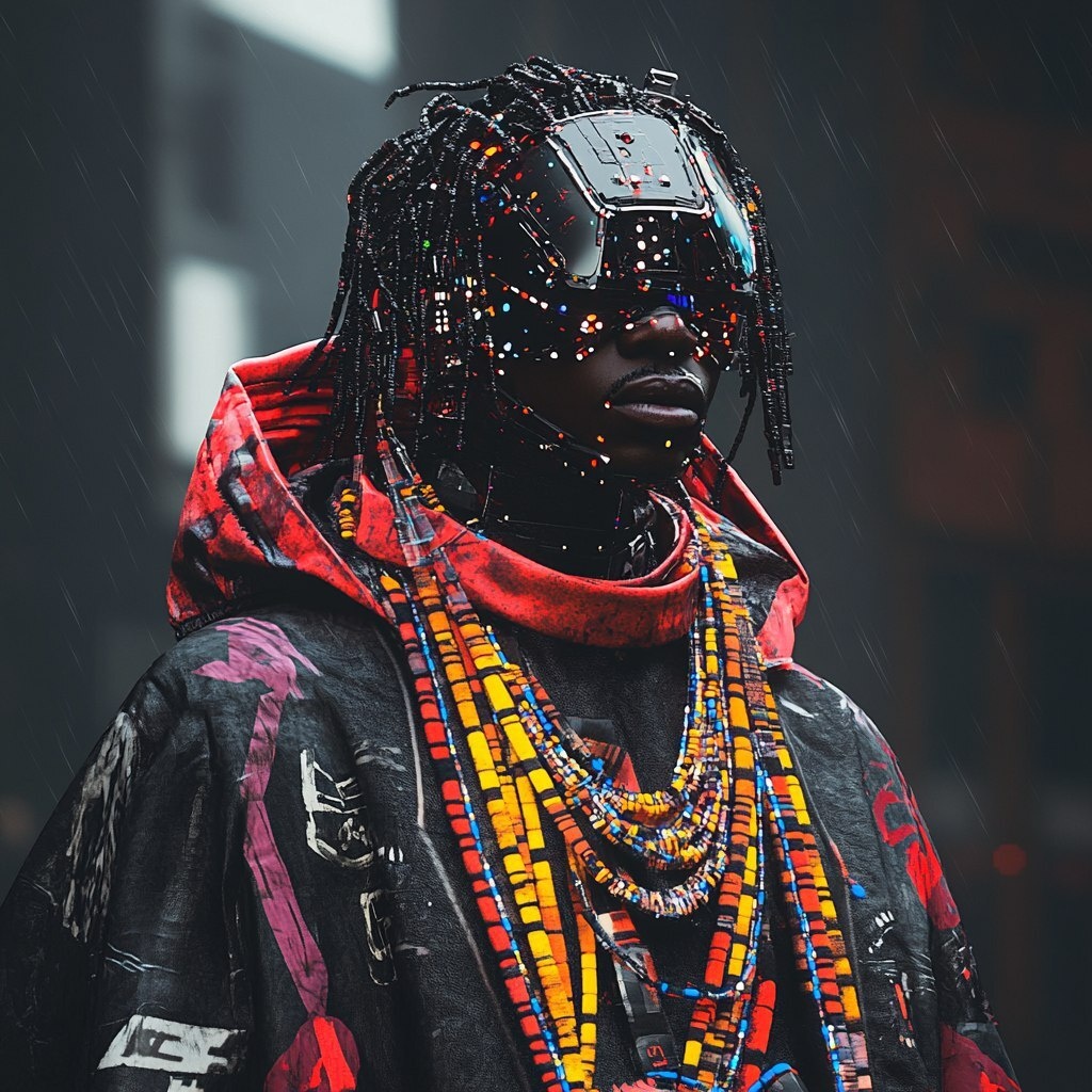 Создано на основе запроса: A futuristic cyber warrior blending West African tribal clothing with 1990s hip hop fashion, set in a dystopian world where technology and organic life have merged. The warrior's armor is made of shimmering nano-bots, forming intricate patterns reminiscent of traditional tribal designs, combined with bold 90’s hip hop elements like oversized jewelry, streetwear-inspired accessories, and vibrant colors. The scene is dark and gritty, with a mix of organic and technological textures, glowing neon accents, and a post-apocalyptic urban backdrop. Style: highly detailed, cyberpunk meets tribal fusion, vibrant yet gritty, cinematic lighting. - - v 5 --- Автоперевод: Футуристический кибер -воин, смешивающий западноафриканскую племенную одежду с модой хип -хопа 1990 -х годов, расположенная в антиутопическом мире, где объединились технологии и органическая жизнь. Как тебе генерация? 🤔 https://dzen.ru/id/65c0c65c86e4f837c27b24d7 #ИИ #AI #нейросеть #midjourney #a