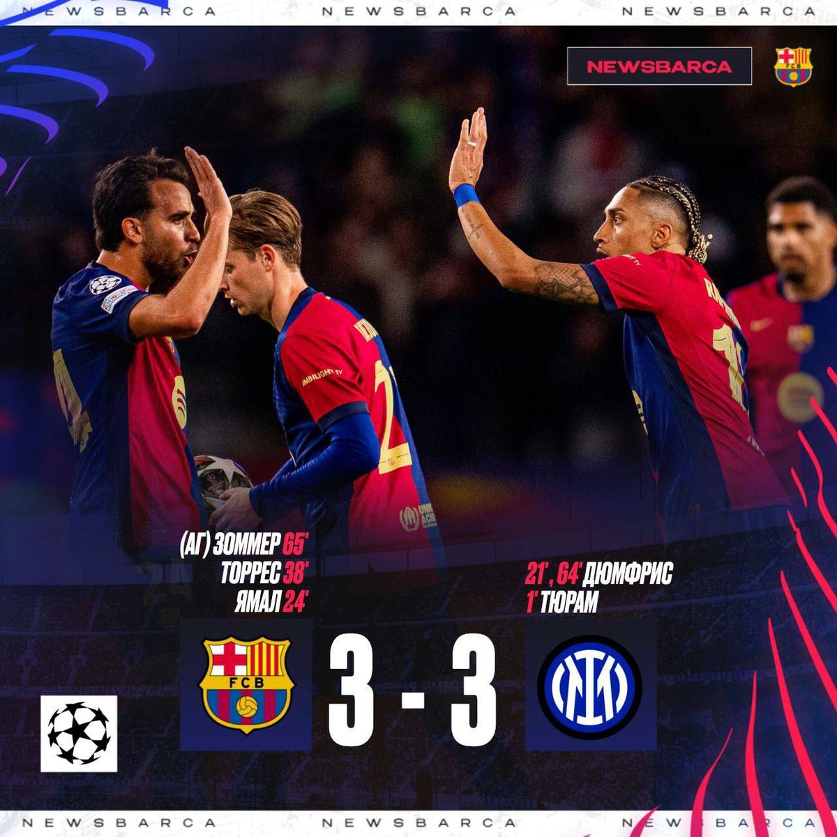🎇Фейерверк🎆 голов в Барселоне и ничья по итогу первого матча! 🤝⚽ Команда Ханси Флика дважды отыгрывалась💫. Тюрам открыл счет изящным ударом пяткой уже на 31-ой секунде (рекорд ЛЧ в полуфиналах!), Дюмфрис дважды огорчил Щчесного после подач с углового. Ямаль в 17 лет👦 стал самым молодым автором гола в полуфинале ЛЧ, превзойдя достижение Мбаппе. Торрес тоже забил, а вишенкой на торте стал фантастический выстрел Рафиньи из-за пределов штрафной: мяч от перекладины срикошетил в прыгнувшего Зоммера и от вратаря залетел в ворота! "Интер" положил и четвертый, но гол Мхитаряна отменил ВАР из-за микроскопического офсайда! 3:3 в итоге, ярчайший первый матч, в котором, нужно признать, "Интер" смотрелся ничуть не хуже "Барсы". Все решится в Милане 🔥🔥🔥