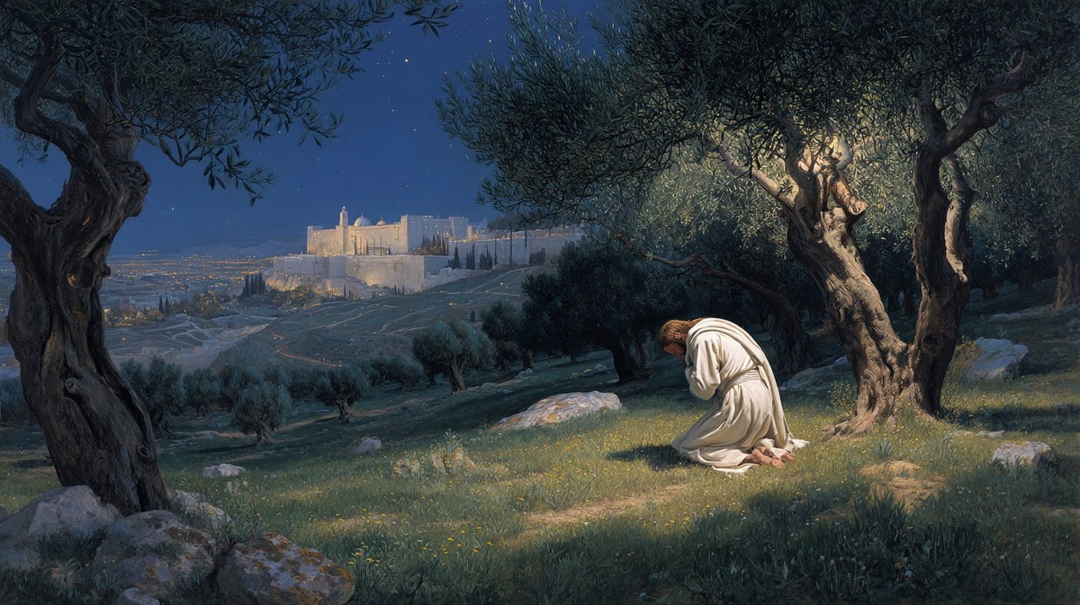 Создано на основе запроса: A wide shot of Jesus on his knees praying fervently in the Garden of Gethsemane while his disciples sleep in the
