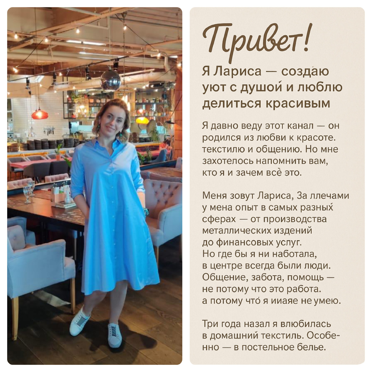 Привет! Меня зовут Лариса — и, возможно, вы уже давно со мной, а может, только что заглянули на канал. Так или иначе — давайте снова (или впервые) познакомимся по-настоящему. У меня за плечами немаленький путь — я работала в разных сферах: от производства металлических изделий до финансовых услуг. Но есть одна вещь, которая всегда оставалась главной — люди. Общение, помощь, искреннее желание сделать кому-то чуть легче, чуть теплее, чуть радостнее — это не про должностные обязанности, это просто мой способ быть. Три года назад я совершенно неожиданно для себя влюбилась… В домашний текстиль. В постельное бельё, которое не просто “вещь”, а часть пространства, уюта, сна, жизни. Часть целой трети нашей жизни. За это время я научилась очень многому: — отличать по-настоящему качественные натуральные ткани — понимать, почему пошив — это не мелочь, а ключ к долговечности — чувствовать клиента: по вкусу, по ритму жизни, по характеру — и, конечно, подбирать цвет, фактуру, настроение, чтобы каждо