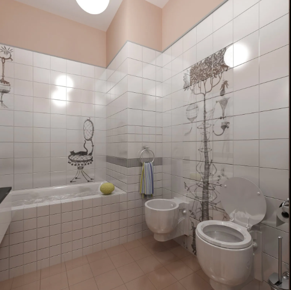 Можно было выложить по пояс, а остальное покрасить влагостойкой краской — вышло бы и дешевле, и визуально легче. А так — ощущение керамического саркофага.
