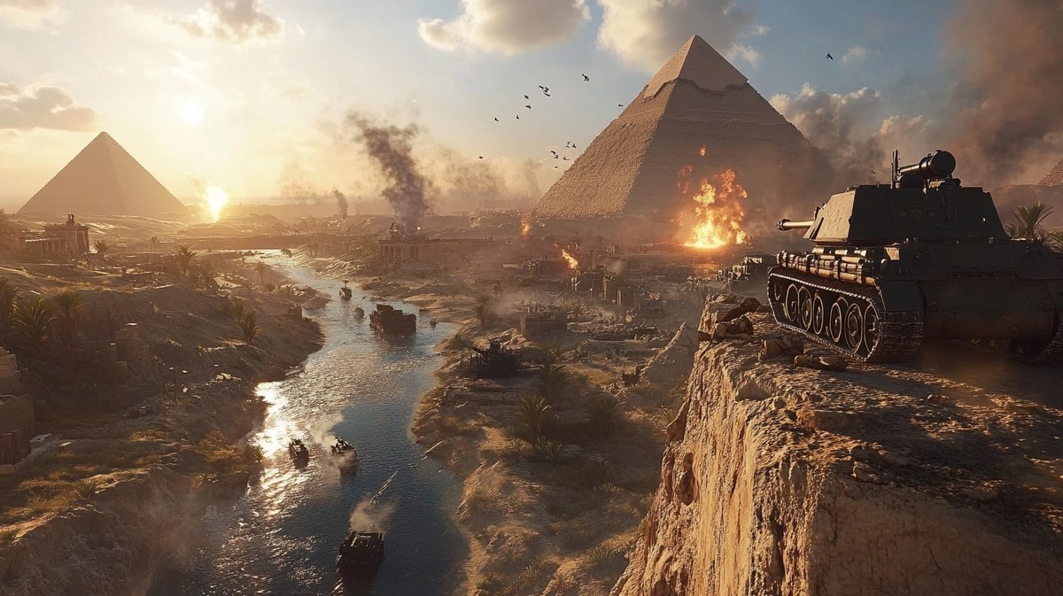 Создано на основе запроса: The image is a cinematic, wide-angle digital artwork styled like a military strategy game or film poster. It captures a dramatic, immersive scene focused on a an elevated cliffside, with the Egyptian pyramids looming prominently in the background --- Автоперевод: Изображение представляет собой кинематографическое, широкоугольное цифровое произведение, стильное как игра военной стратегии или плакат фильма. Как тебе этот вариант? 🤔 https://dzen.ru/id/65c0c65c86e4f837c27b24d7 #ИИ #AI #нейросеть #midjourney #art