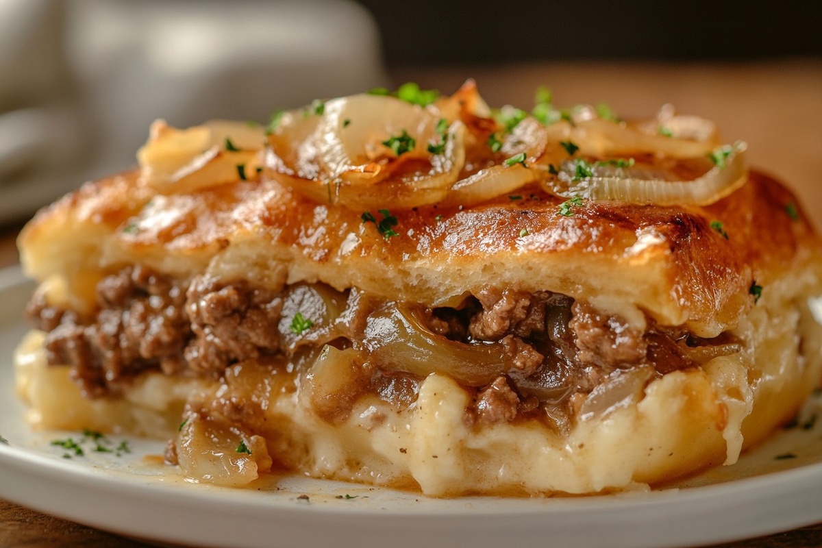 Создано на основе запроса: Title: French Onion Ground Beef Casserole | STYLE: Close-up Shot right view | EMOTION: realistic as possible