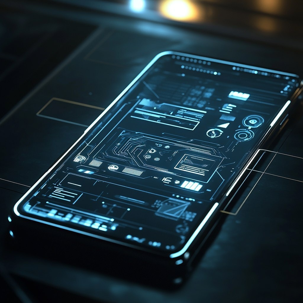 Создано на основе запроса: a phone laying flat on a table. with futuristic UI on the screen. --- Автоперевод: Телефон, укладывающий плоский на столе. Отлично получилось? 🤔 https://dzen.ru/id/65c0c65c86e4f837c27b24d7 #ИИ #AI #нейросеть #midjourney #art