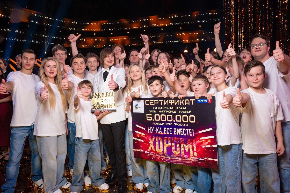 На телеканале «Россия» состоялся финал второго сезона шоу «Ну-ка, все вместе! Хором!». Победу, Кубок проекта и денежный приз в размере пяти миллионов рублей завоевали «Хор русской песни» Владимирского областного музыкального колледжа им. А.П. Бородина и «Капелла Дмитрия Железнова» из Казани. Победители шоу «Ну-ка, все вместе! Хором!». Фото: пресс-служба телеканала «Россия» В финальном баттле оба коллектива получили от судей рекордные 99 баллов, поэтому по инициативе лидера сотни Сергея Лазарева им обоим присудили победу. На втором месте расположился «Академический хор студентов и выпускников Уральского федерального Университета» из Екатеринбурга. Победители шоу «Ну-ка, все вместе! Хором!». Фото: пресс-служба телеканала «Россия» Лазарев уверен, что второй сезон шоу «Ну-ка, все вместе! Хором!» получился потрясающим, а два победителя выделили абсолютно заслужено. «Мне кажется, каждый финалист заслуживает 100 баллов. Вы потрясающие! Огромное вам спасибо, дорогие коллективы, кто принимал уч